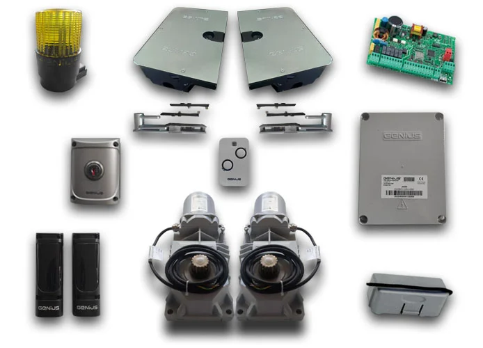 GENIUS - KIT FÜR TORE MIT ZWEI FLÜGELTÜREN MIT MAXIMALER BREITE 3,5 m UND 500 kg GEWICHT PRO FLÜGEL, KOMPLETT MIT ZUBEHÖR